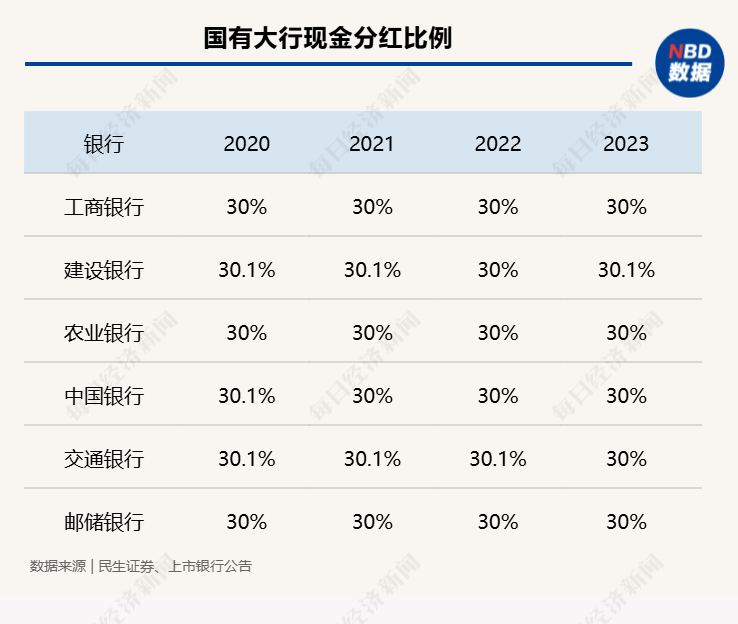 民生证券研报数据显示,2019年至2022年,上市银行现金分红比例持续稳定在30%附近,2023年银行板块现金分红比例为30.9%。