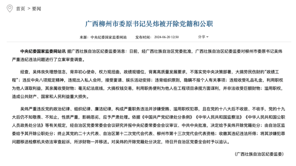 经自治区党委常委会会议研究并报中央纪委常委会会议审议、中共中央批准,决定给予吴炜开除党籍处分;由自治区监委给予其开除公职处分;终止其党的二十大代表、自治区第十二次党代会代表、柳州市第十三次党代会代表资格;收缴其违纪违法所得;将其涉嫌犯罪问题移送检察机关依法审查起诉,所涉财物一并移送。对吴炜的开除党籍处分决定,待召开自治区党委全会时予以追认。