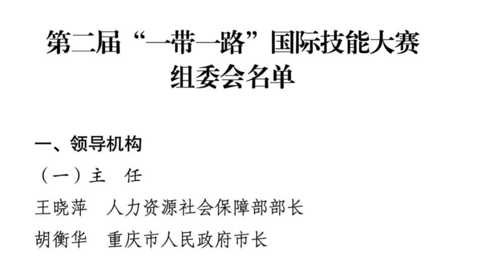 担任本届“一带一路”国际技能大赛组委会主任的是人社部部长王晓萍、重庆市市长胡衡华。