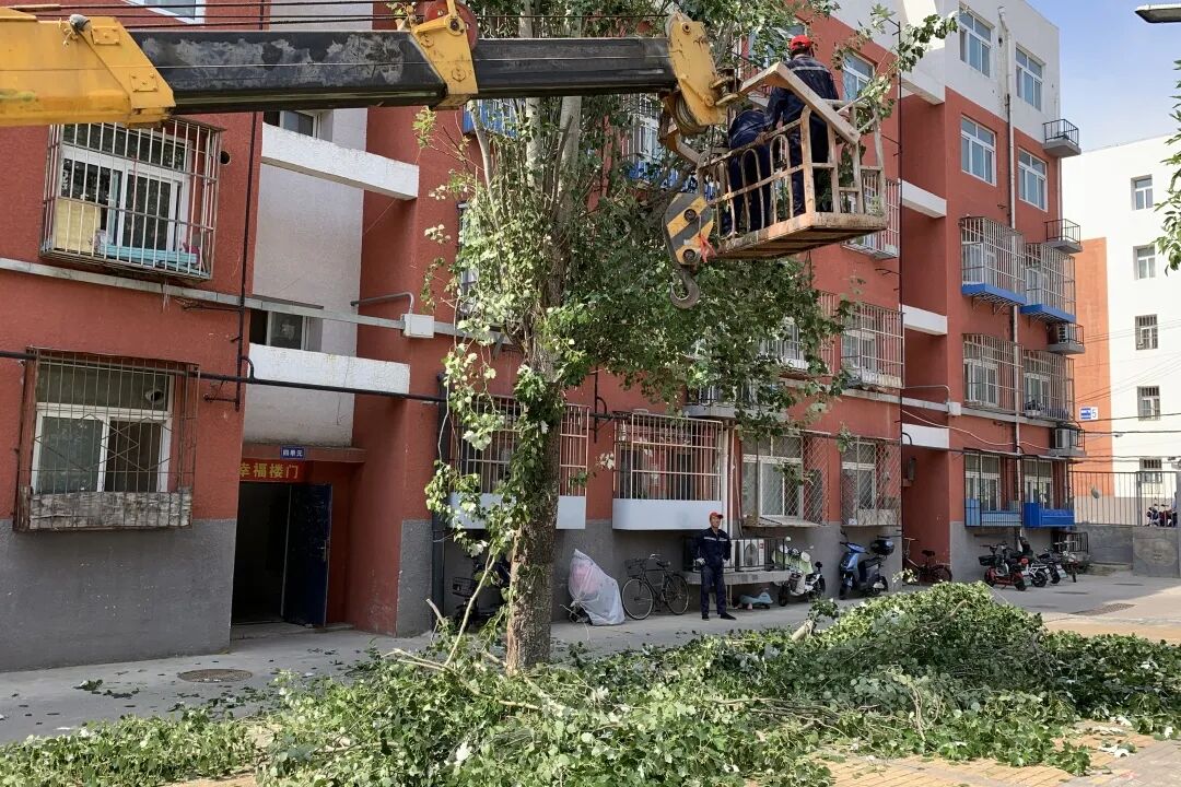 6月初,北京“来势汹汹”的几场大风吹断了社区内不少树枝。大风过后,物业立即出动,对树木进行了统一“理发”,防止掉落的树枝给居民、车辆造成意外伤害。