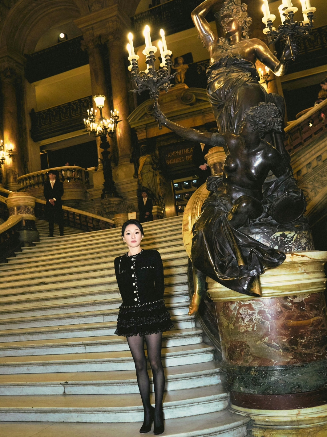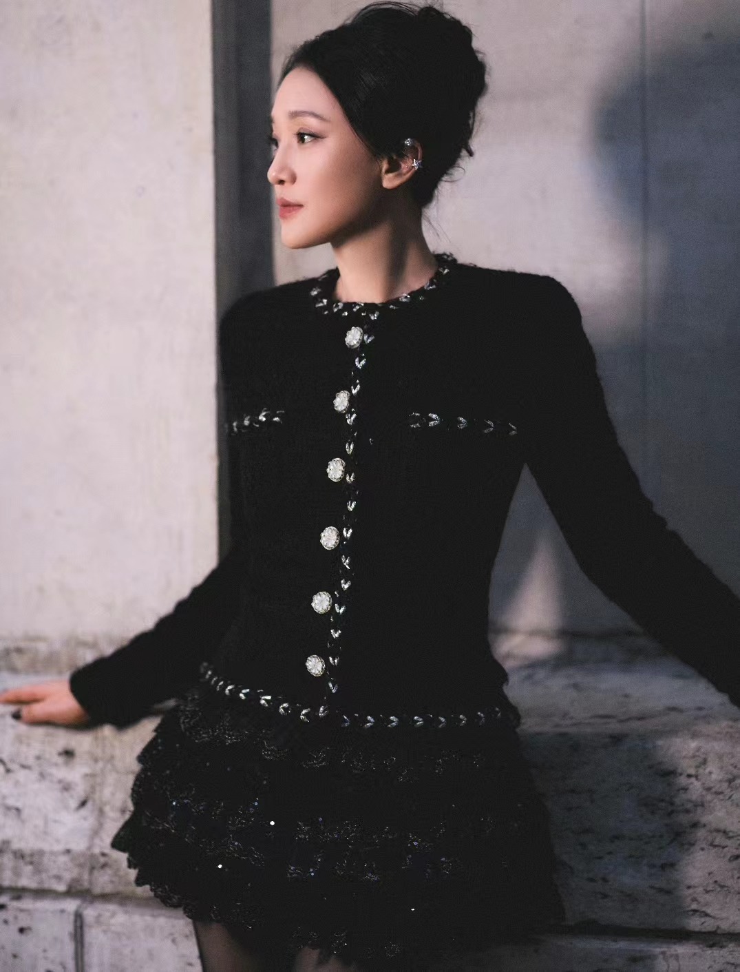 周迅亮相Chanel2024秋冬高定大秀,身穿香奈儿2023春夏高定黑色斜纹软呢刺绣荷叶边外套,搭配香奈儿猫眼墨镜,整体风格摩登优雅。古堡大片女王气场铺满屏幕,有一种华丽而神秘的欧洲电影感。