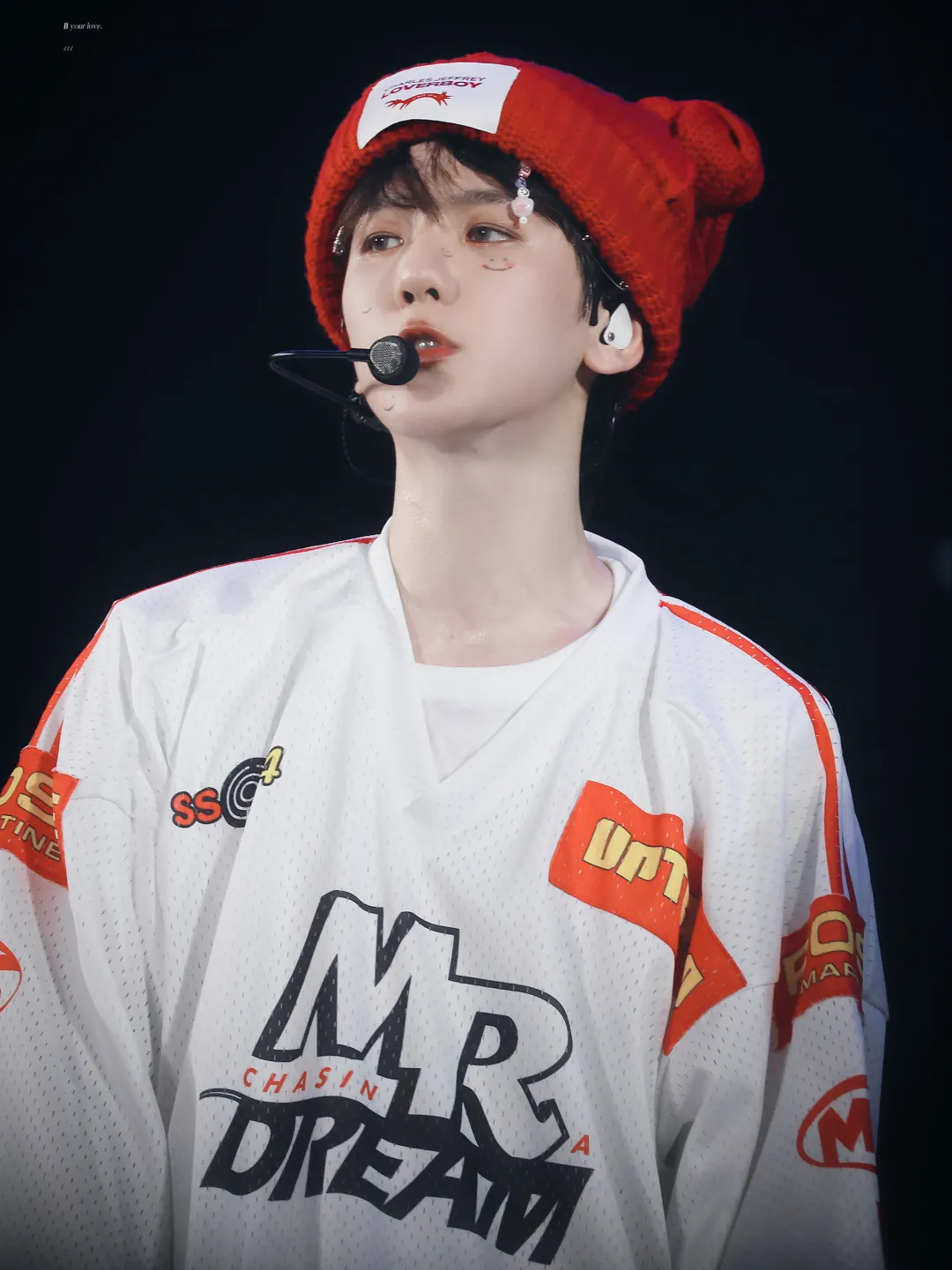 边伯贤在演唱会时也换上球衣,与张凌赫的运动男高风不同,边伯贤头戴一顶红色毛线帽将球衣的运动风中和,增加了俏皮可爱感,更加具有时尚感和场景限定性,适合作为演唱会打歌服。并且球衣宽松便于舞蹈和跑动,是很多艺人在表演时的top选择。穿球衣唱跳的边伯贤,让台下粉丝们更加热情欢呼~