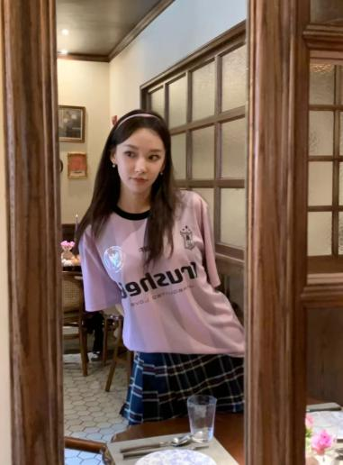 实力爱豆程潇身穿SLY粉紫色字母球衣搭配格纹半裙与好友们聚会,整体低明度的穿搭配色,粉紫与深蓝碰撞,复古俏皮感融合运动风与少女的甜酷感。混搭的blockcore在复古氛围感餐厅中别具一番特色。
