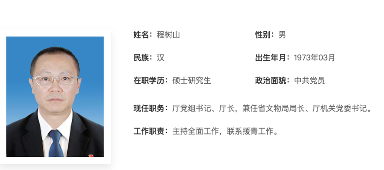 2023年4月,程树山任青海省文化和旅游厅党组书记,后任厅长。