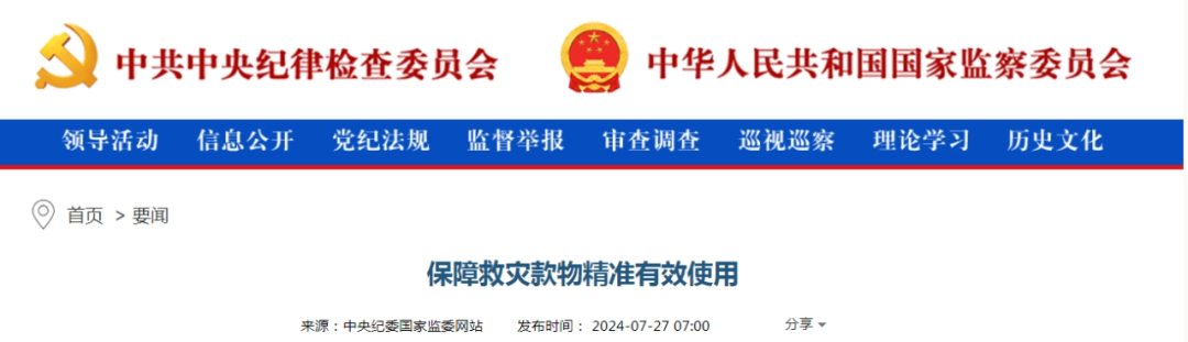 7月27日,中央纪委国家监委网站发文介绍保障救灾款物精准有效使用相关措施。