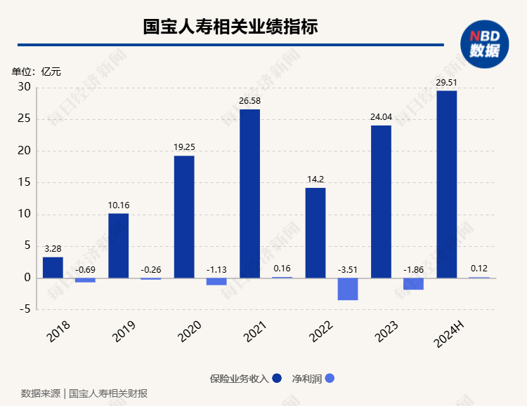 定期报告显示,国宝人寿自2018年成立以来,除2021年略有盈利外,其他年度均处于亏损状态。具体来看,2018年~2023年,国宝人寿保险业务收入分别为3.28亿元、10.16亿元、19.25亿元、26.58亿元、14.20亿元、24.04亿元;对应的净利润分别为-0.69亿元、-0.26亿元、-1.13亿元、0.16亿元、-3.51亿元、-1.86亿元。