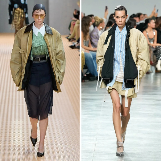 在品牌秀场巴恩风穿搭也屡见不鲜,Prada廓形棉服外套搭配透视感薄纱裙,粗犷的谷仓夹克搭配薄纱裙,更具有一种刚柔并济的韵味,Rabanne拼接外套玩转叠穿展现休闲街头范。
