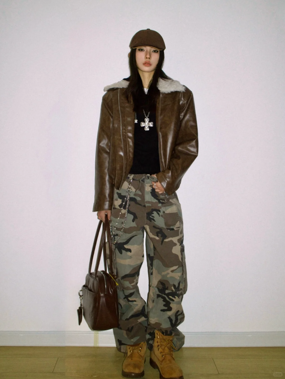 巴恩风棕色翻领皮夹克,玩转复古腔调,搭配一条阔腿迷彩裤,穿出别具一格的时尚感,复古感的配饰也必不可少,一顶前进帽将人拉回上个世纪的时尚。黑色前短后长翻毛领皮衣内搭一件灰色运动感连衣裙,两种风格的混搭却是呈现一种更加智性、大方的感觉。