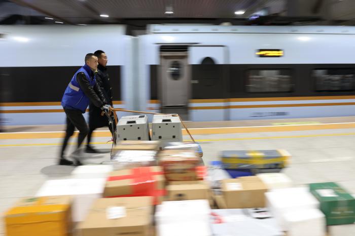 2月1日,在兰州西站站台上,中铁快运兰州西站营业部工作人员马俊高(右)和孙谦准备将旅客托运的宠物送上高铁列车。新华社发(王光辉 摄)