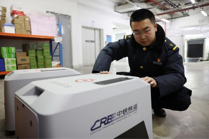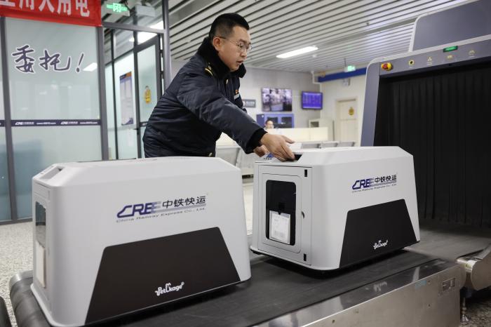 2月1日,中铁快运兰州西站营业部工作人员孙谦在高铁列车开车前检查宠物情况。新华社记者 陈斌 摄