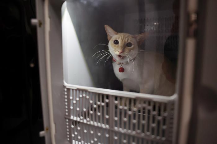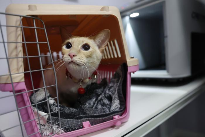 2月1日,在中铁快运兰州西站营业部宠物交接区,一只小猫准备进入高铁宠物运输专用箱。新华社记者 陈斌 摄