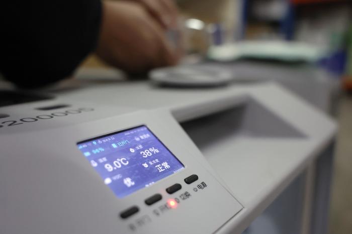 2月1日,高铁宠物运输专用箱的液晶屏上显示着实时温度、湿度和氧浓度等信息。新华社记者 陈斌 摄