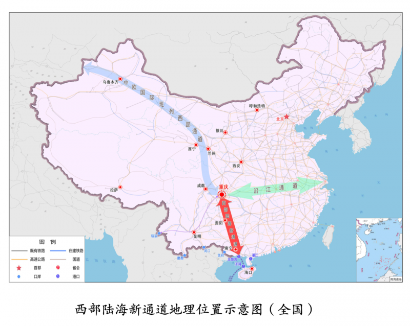 西部陆海新通道以重庆为运营中心,各西部省区市为关键节点,利用铁路、海运、公路等运输方式,向南经广西、云南等沿海沿边口岸通达世界各地。