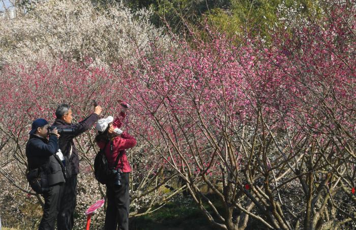 春节期间,浙江杭州西溪湿地梅花进入盛花期,吸引游客前来踏春赏花。