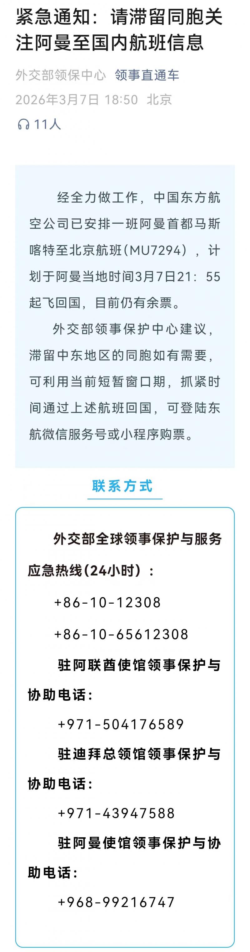 领事直通车发紧急通知:东航飞北京航班MU7294仍有余票,计划阿曼当地时间7日21:55起飞
