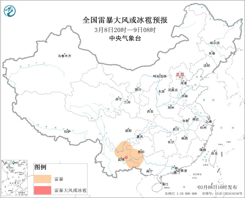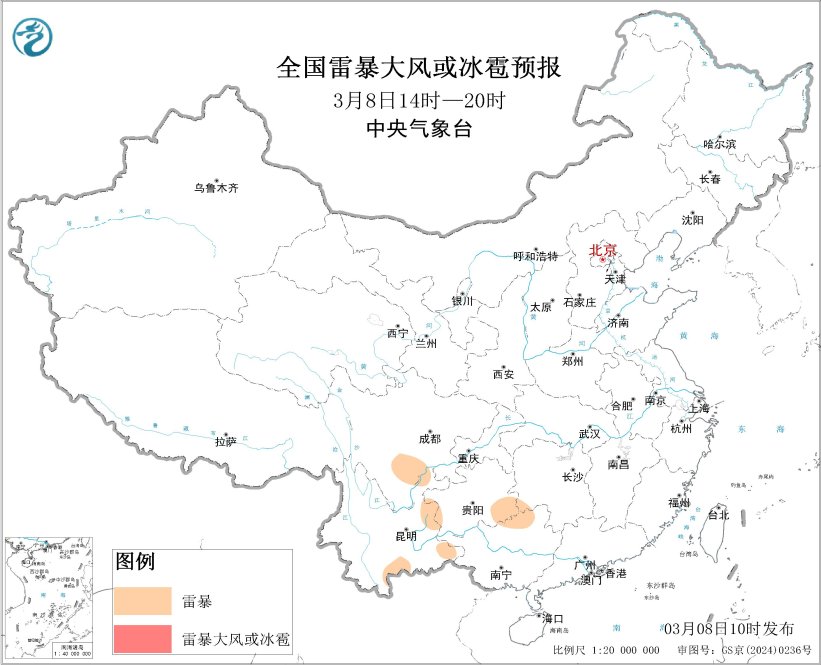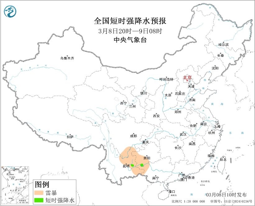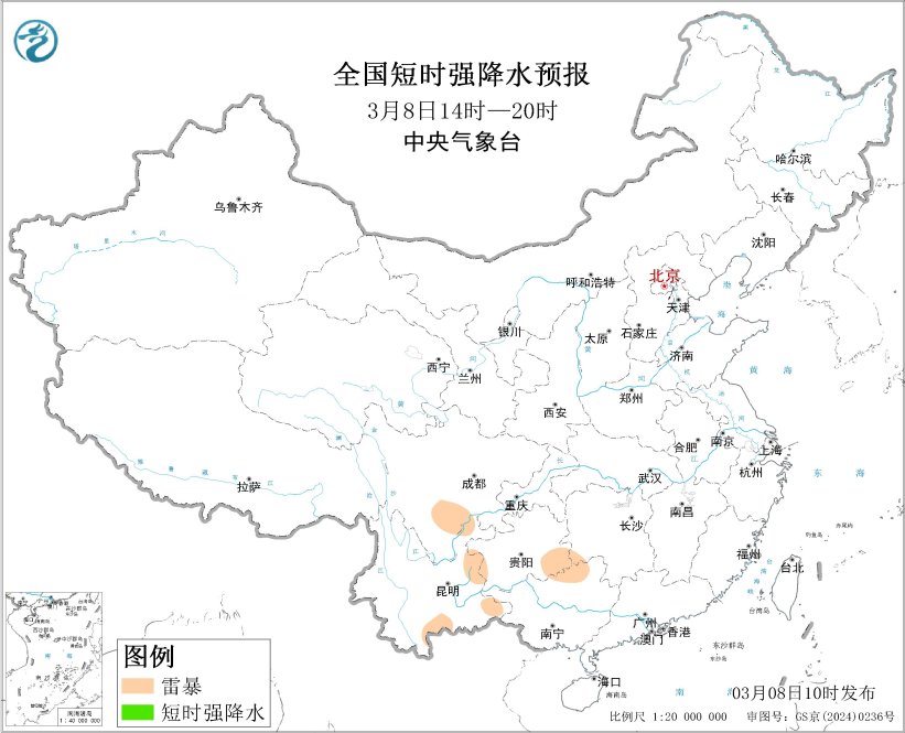 预计3月8日14时至9日08时,四川南部、贵州西部和南部、云南东部、广西北部等地的部分地区将有雷暴天气;贵州西南部、云南东部、广西西北部等地的局地将有短时强降水天气,小时雨量20-30毫米。