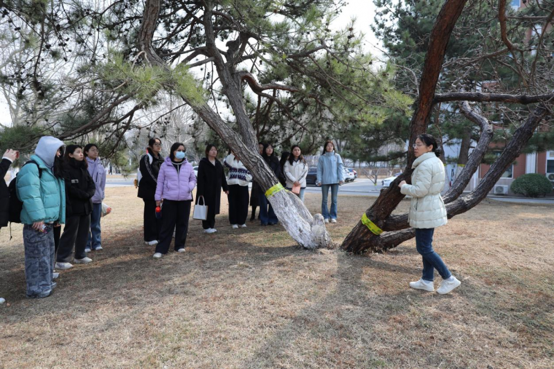 在学校礼堂前,一场“识树医木”活动正在进行。学校植物健康研究院的赵晓燕教授、任争光副教授、何李迁副教授带领同学们逐一“问诊”路边的树木。在一棵松树前,老师轻轻剥开一块树皮,向同学们示意:“这里有蛀干害虫的痕迹。病虫害防控的关键在于‘早发现、早诊断’。”老师们将专业知识转化为通俗易懂的语言,从树木的生长特性讲到生长周期,从适宜环境讲到养护技巧。同学们则凑上前去仔细观察、拍照记录。“听了今天的课才发现,每一棵树都有自己的‘脾气’,作为植物保护专业的学生需要深入了解树木,才能更好地养护好它们。”