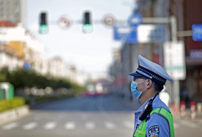 9月18日9时18分,一位交通警察在沈阳市一路口执勤听到防空警报时肃立。