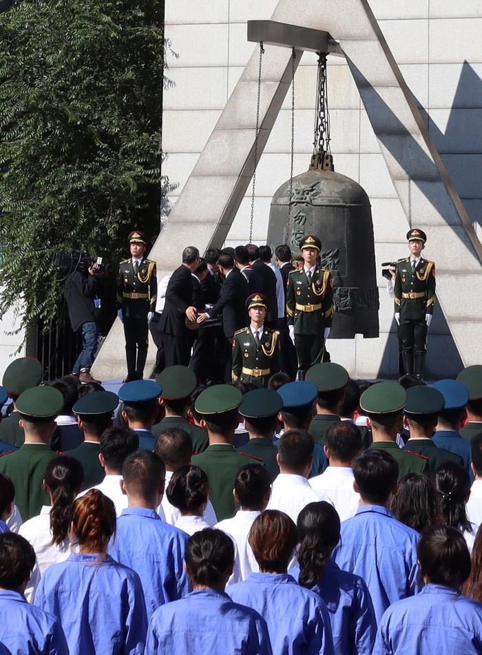 这是9月18日拍摄的勿忘“九一八”撞钟鸣警仪式现场。当日是“九一八”事变89周年纪念日,勿忘“九一八”撞钟鸣警仪式在辽宁省沈阳市“九一八”历史博物馆残历碑广场举行。上午9时18分,沈阳市上空响起勿忘“九一八”的防空警报,以此铭记历史。