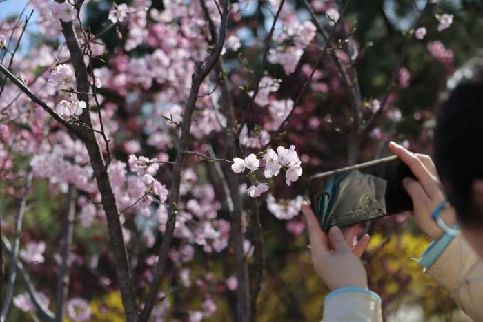 市民从北小河公园东门出发,沿滨水绿道一路东行,沿途可赏阳光樱、江户樱、飞寒樱等10余种樱花,花色从粉红、浅粉到绯红、粉白、浅黄绿次第变换,花期从3月下旬一直延续至4月底。