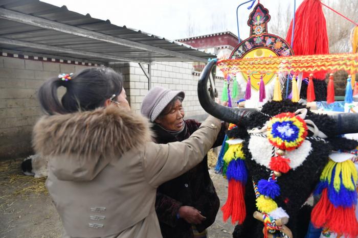 德庆卓玛(右)和邻居一起装饰第二天要参加春耕仪式的拖拉机(3月15日摄)。德庆卓玛今年65岁了,她母亲的名字里也有“卓玛”两个字。母女俩都出生在牛棚里,并且一出生就是贵族庄园里没有人身自由的农奴。