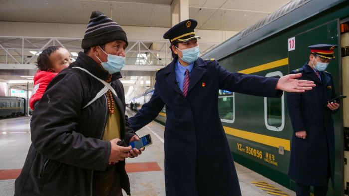 斯朗卓玛(中)在拉萨火车站引导乘客上车(3月22日摄)。又过了10多年,一个叫斯朗卓玛的女孩降生在藏东山谷中的昌都。后来,她成为西藏第一代铁路人。今年40岁的斯朗卓玛记得,她小时候上小学,先要翻山越岭徒步3天,再站在卡车车斗里颠簸1天,才能从村里到达县城。后来,她考上内地西藏班,还要再坐车、坐船,经过十天半个月才能到达初中所在地湖南岳阳。