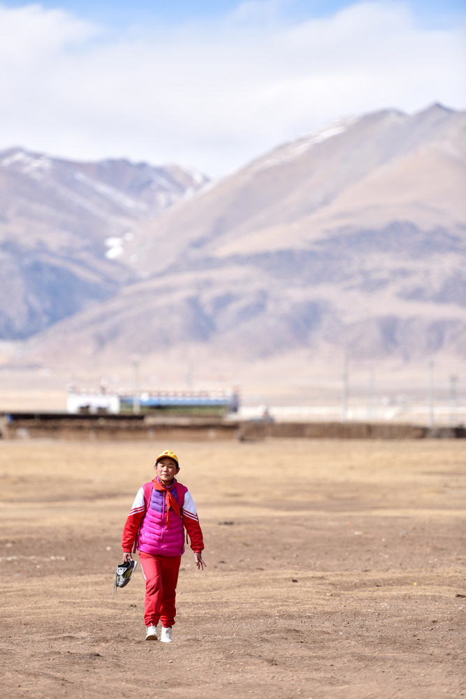多吉卓玛放学后拎着球鞋回家(3月10日摄)。在北方的牧场上,龙仁乡中心小学一年一度的足球联赛要开始了,多吉卓玛准备出发,妈妈走上前来笑了笑,递给她一双崭新的球鞋。球场上刮起了风,吹得人脸有些生疼,但球场边的观众席早已被占满。穿上新球鞋,多吉卓玛叫上女生伙伴,加入了男孩的队伍。