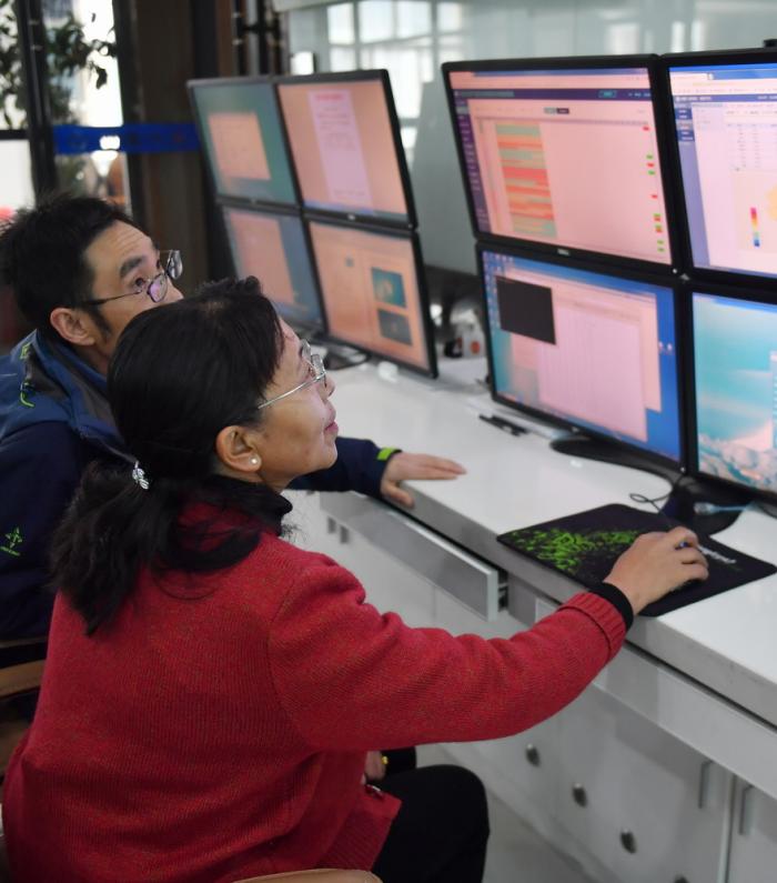 卓玛(右)和同事在西藏自治区气象局的办公室讨论气象数据(3月12日摄)。民主改革之后10年,一个叫卓玛的女孩在珠峰脚下的日喀则出生。现在,她是西藏气象领域里的顶尖专家。