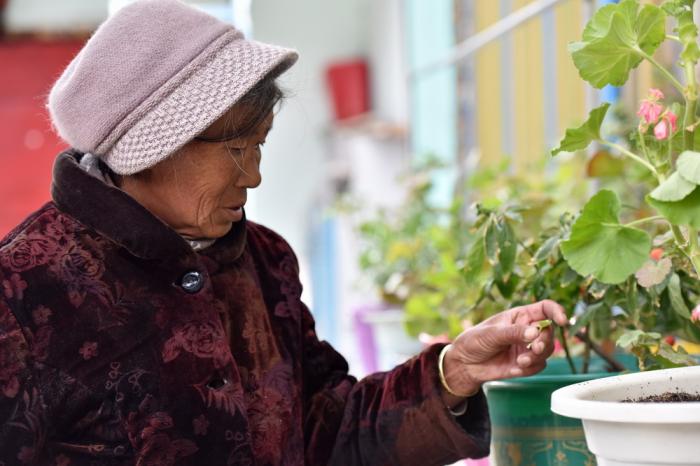 德庆卓玛在山南市乃东区克松社区的家里照看花草(3月15日摄)。1959年3月,命运的转折来临。中国共产党领导西藏各族人民进行民主改革,打碎了封建农奴制的枷锁。德庆卓玛也终于走出牛棚,她的家乡——现山南市乃东区克松社区当年率先进行民主改革,被称为“西藏民主改革第一村”。