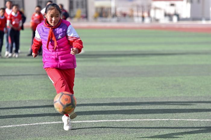 多吉卓玛参加学校的足球兴趣课(3月9日摄)。13岁的牧区姑娘多吉卓玛刚开始踢足球时,父母也告诉她:“女孩子要有女孩子样。”她只有一双很硬的靴子,放牛和踢球时都穿它,在足球兴趣小组,教练还提醒她说,穿这样的鞋运动容易受伤。