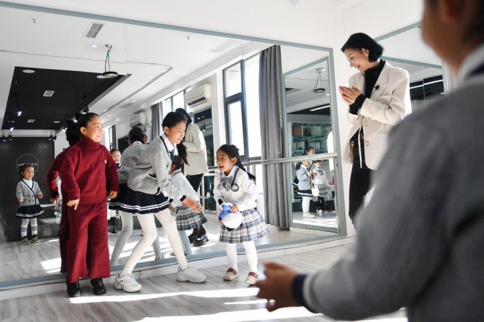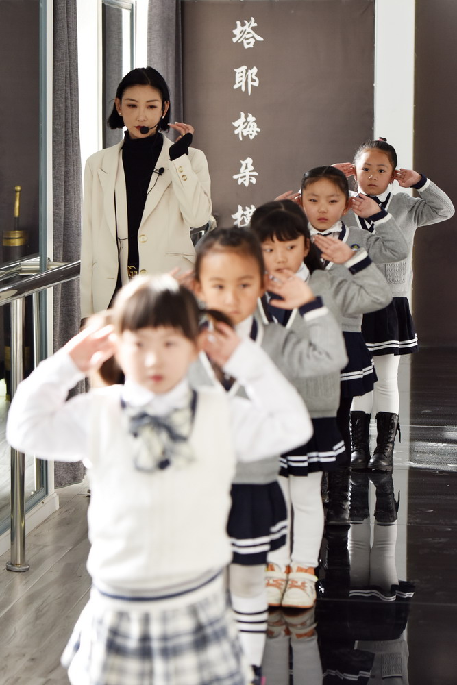 洛桑卓玛(右后)和参加少儿模特培训的学生们一起做游戏(3月13日摄)。“我很看重孩子的独立和自信。”洛桑卓玛说,自己很幸运,在做自己热爱的事情,她希望她的学生们也可以找到这份热情。