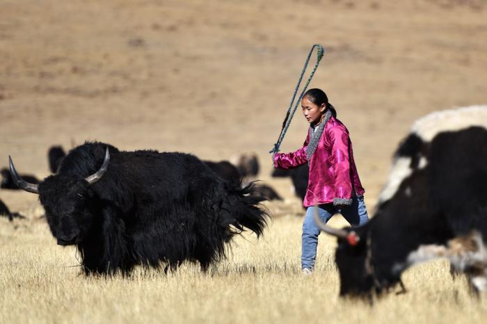 多吉卓玛在放牛(3月10日摄)。学校老师很支持多吉卓玛。她就读的拉萨市当雄县龙仁乡中心小学开设了足球、篮球、旱冰、舞蹈等多个兴趣小组,还正在筹建女足队。