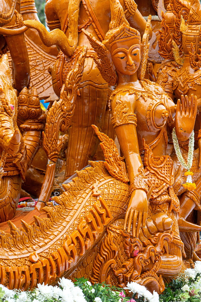 7月14日在泰国乌汶府蜡烛节活动现场拍摄的蜡雕。因疫情暂停两年的泰国蜡烛节,于今年7月11日至17日恢复举行。在7天的节庆中,巨型蜡雕花车巡游是蜡烛节活动的高潮。