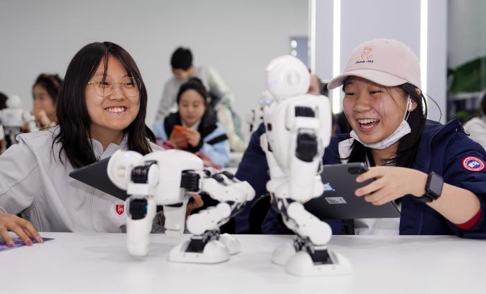 4月9日,学生在石景山人形机器人数据训练中心操控小型机器人。新华社发(靳晶 摄)