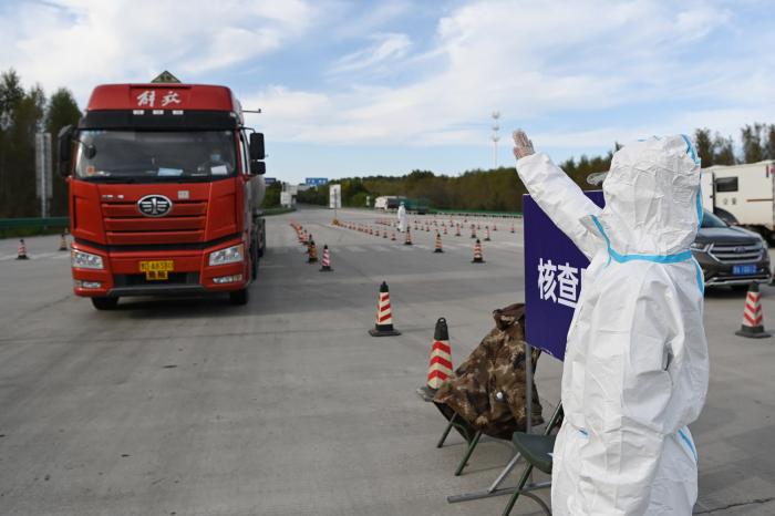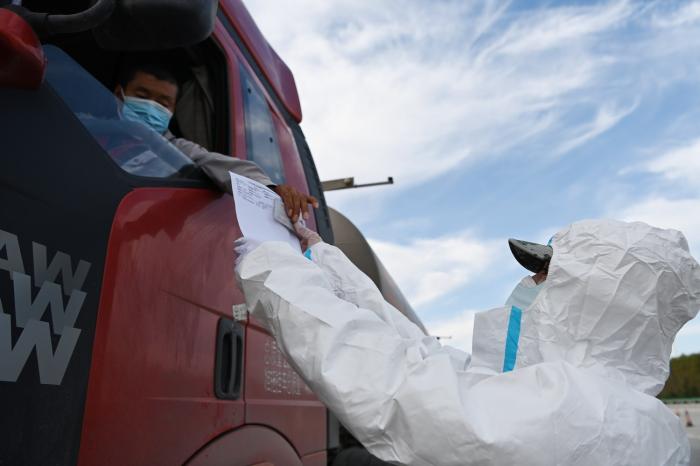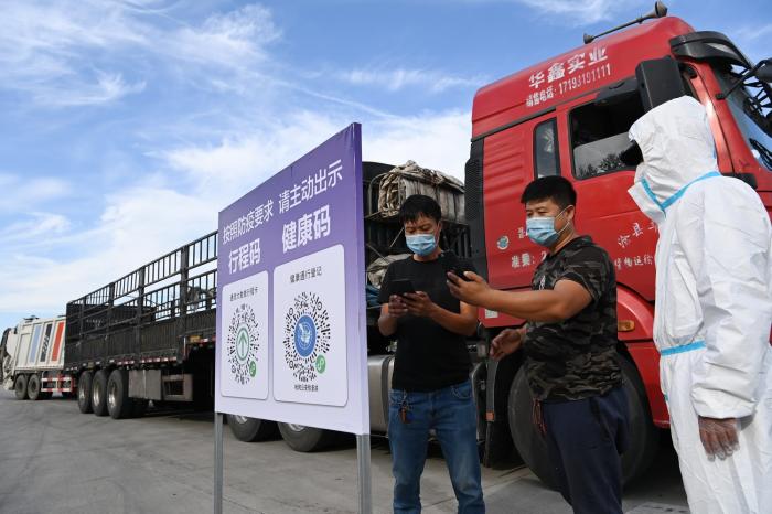 确需外出的,通过哈尔滨太平国际机场、铁路、公路以及客运站出行的人员,应及时了解目的地疫情防控工作要求,持48小时内核酸检测阴性证明,并做好自身防护。图为在哈尔滨一高速公路出城口,货车车内人员在进行扫码(9月23日摄)。