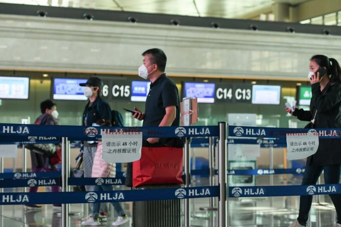 目前,哈尔滨市应对新型冠状病毒感染肺炎疫情工作指挥部提醒广大市民,配合疫情防控工作,减少不必要出行。图为在哈尔滨太平国际机场,工作人员(左)在查看旅客48小时内核酸检测证明(9月23日摄)。