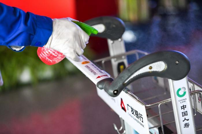 在哈尔滨太平国际机场,工作人员在为手推车消毒(9月23日摄)。