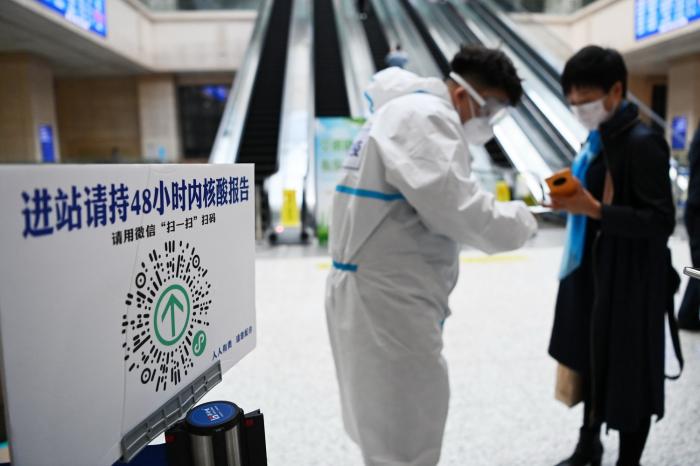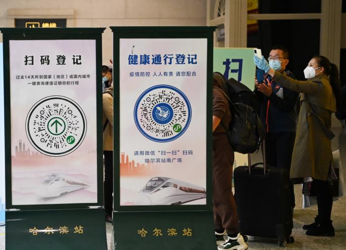 在哈尔滨火车站,旅客在进站候车前进行扫码(9月23日摄)。