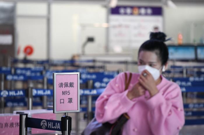 在哈尔滨太平国际机场,一名旅客在整理口罩(9月23日摄)。