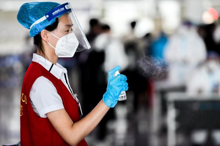 在哈尔滨太平国际机场,一名工作人员在用酒精消毒(9月23日摄)。
