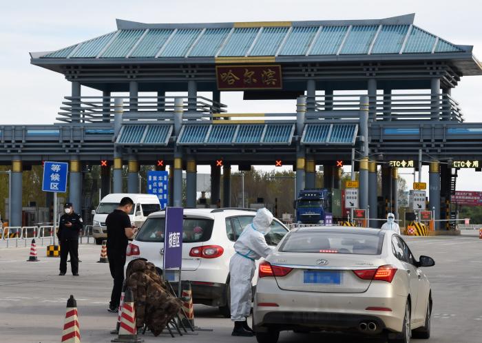 在哈尔滨一高速公路出城口,工作人员示意停车准备检查车内人员的核酸检测报告(9月23日摄)。