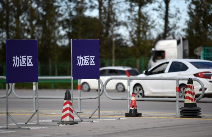 在哈尔滨一高速公路出城口,有车辆被劝返(9月23日摄)。