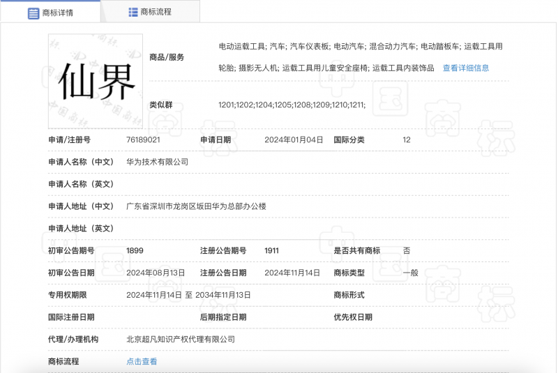 11月21日,据国家知识产权局商标局官方网站,华为近期申请成功了包括“仙界”“天界”“君界”“峥界”等多个商标,国际分类为12,涵盖电动运载工具、汽车及相关产品。