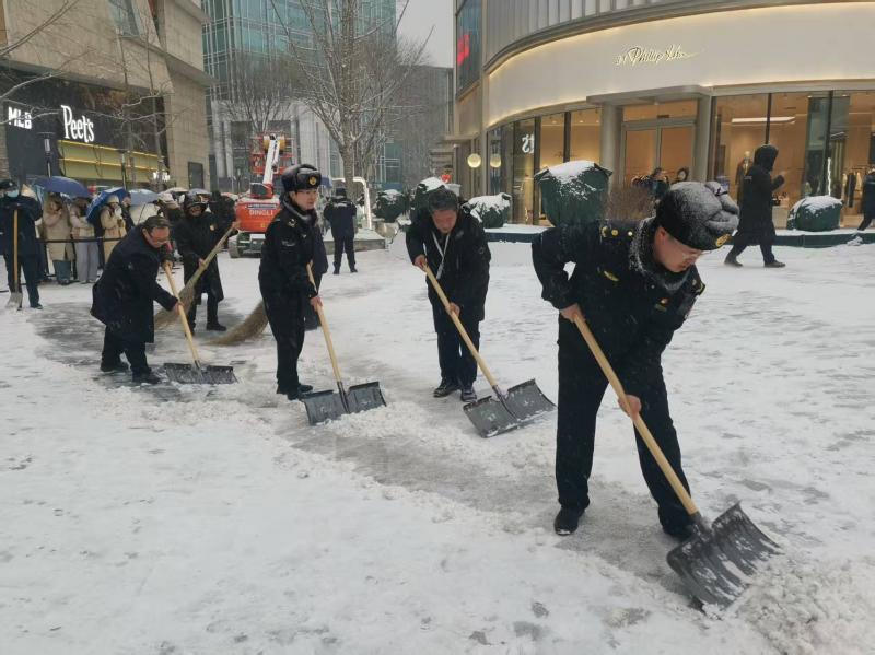 “针对此次降雪,我们按照市、区两级执法部门的要求,在雪前通过实地走访和微信群,向企事业单位及商户发布扫雪铲冰预警提示,要求其做好人员、装备等扫雪铲冰各项准备工作。降雪后,我们派出多组执法力量,对辖区商户开展扫雪铲冰督导工作。”执法人员介绍,一方面督导商户全员参与扫雪铲冰,另一方面要求重点地区、重点部位及时安置好防滑措施。