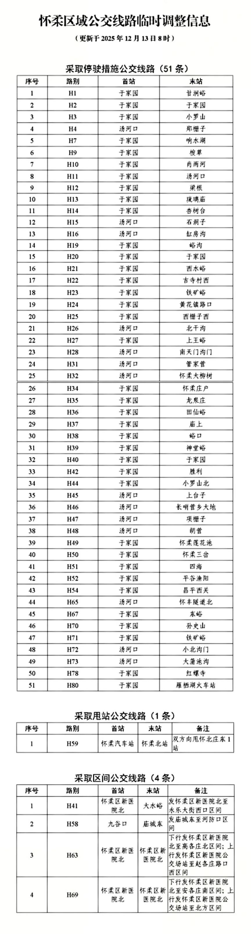 截至今日8时,怀柔区56条公交线路采取临时调整措施