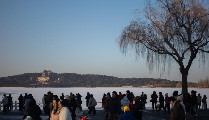 皇家建筑佛香阁与山峦湖泊相映,游人在昆明湖畔打卡拍照。