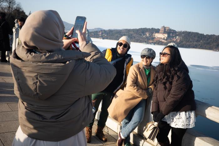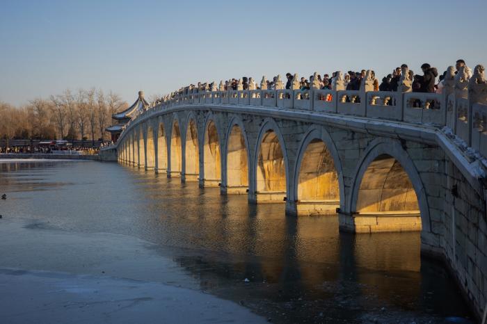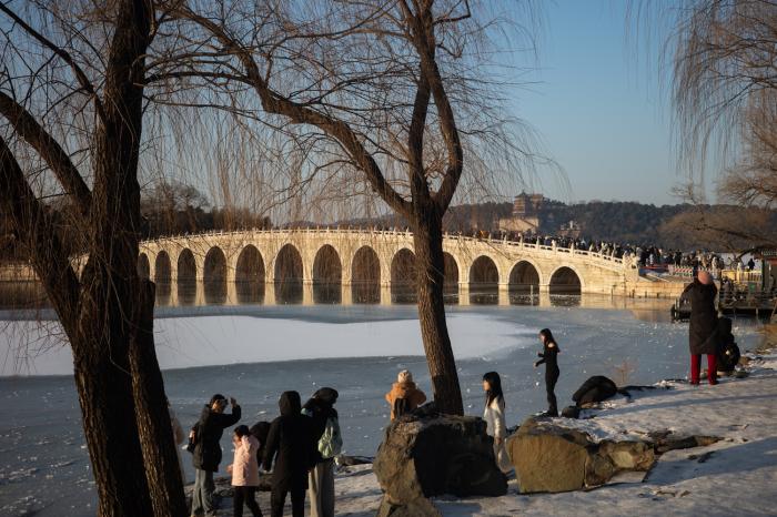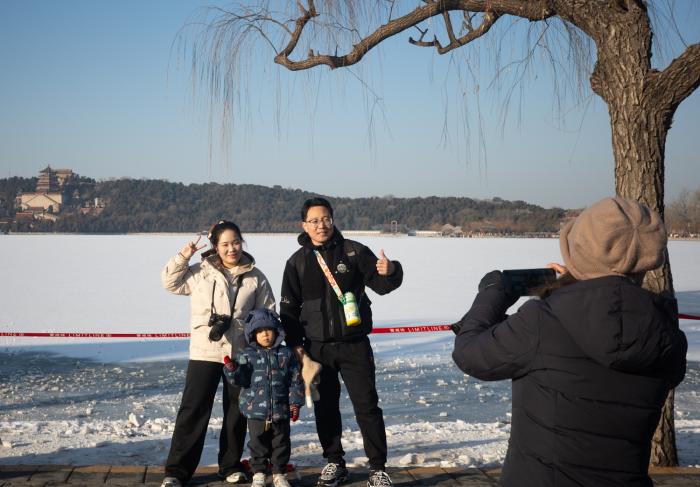 十七孔桥上,游人以佛香阁与冰封的昆明湖为背景拍照。