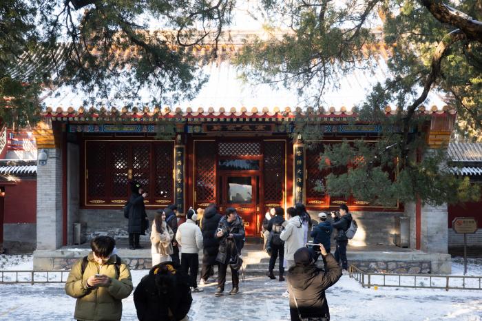 南湖岛上,广润灵雨祠的琉璃瓦上覆盖着皑皑白雪,红墙黄瓦的皇家建筑与落雪相映成趣。