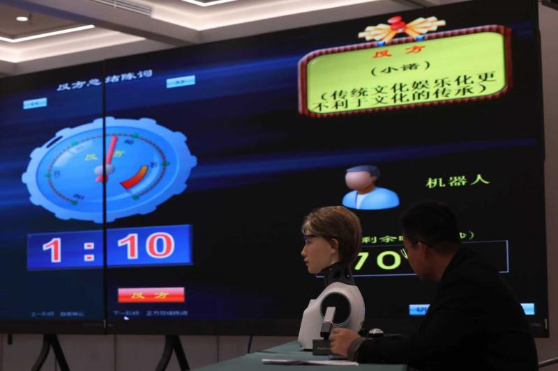 “在今天的辩论中,对方辩友始终在创新传播与娱乐化之间划等号……”下午2时左右,本届北京市中小学生辩论赛高中组冠军——清华大学附属中学广华学校辩论队的三名同学,与首届中国(国际)机器人辩论赛冠军团队——松延动力机器人团队开启激烈辩论。辩论中,清华大学附属中学广华学校辩论队同学通过引用故宫文创创新、“黑悟空”游戏等经典案例,阐释“传统文化娱乐化更有利于文化的传承”这一辩题。而松延动力机器人则随时“接招”并快速作出反应,力证“传统文化娱乐化更不利于文化的传承”辩题。三十分钟的比拼“你来我往”,流畅对答。“如果不是在现场观看,很难想象有一方竟是机器人。”一位观赛观众感慨。