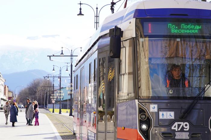 这是12月13日在俄罗斯弗拉季高加索街头拍摄的有轨电车。